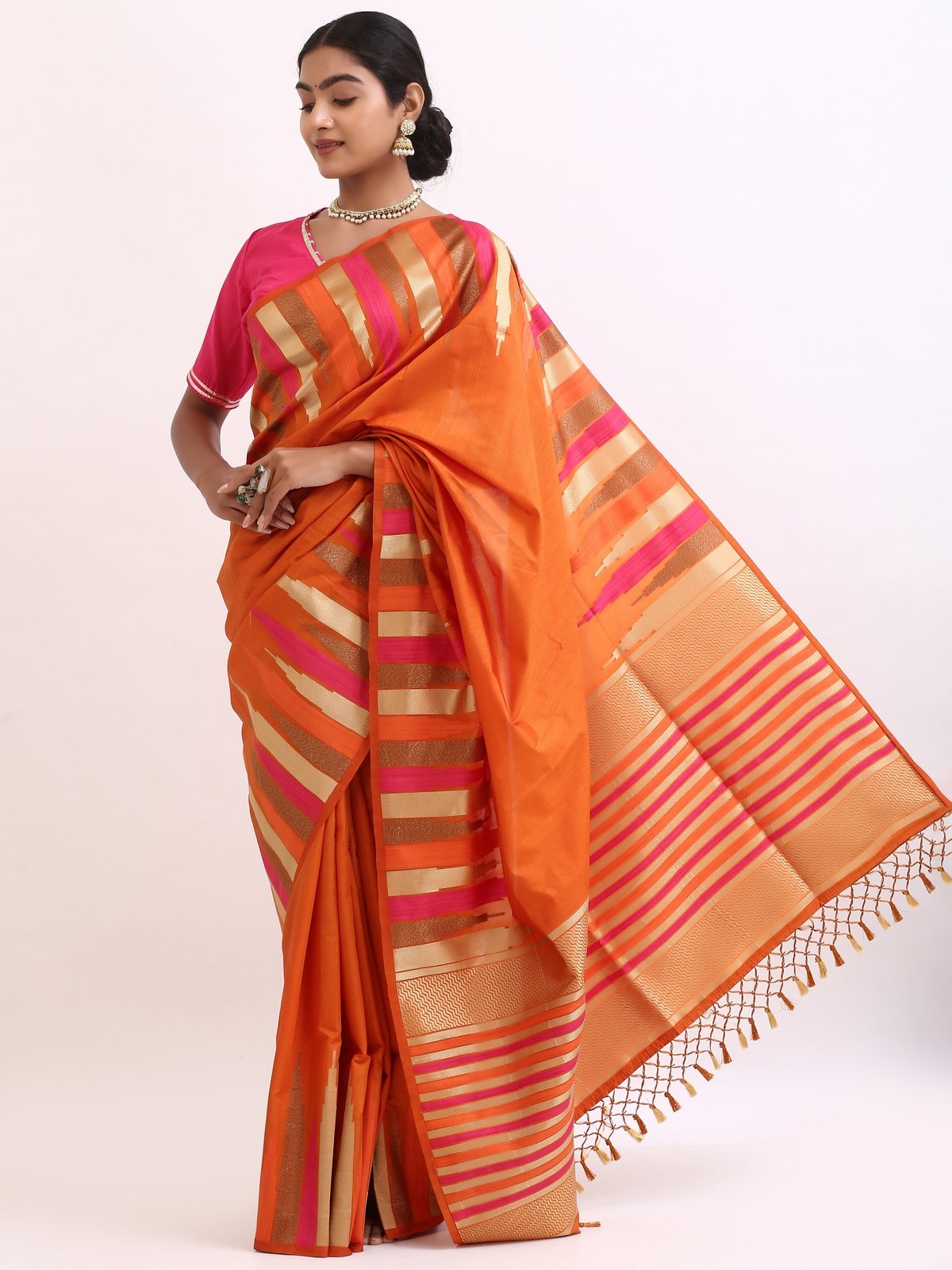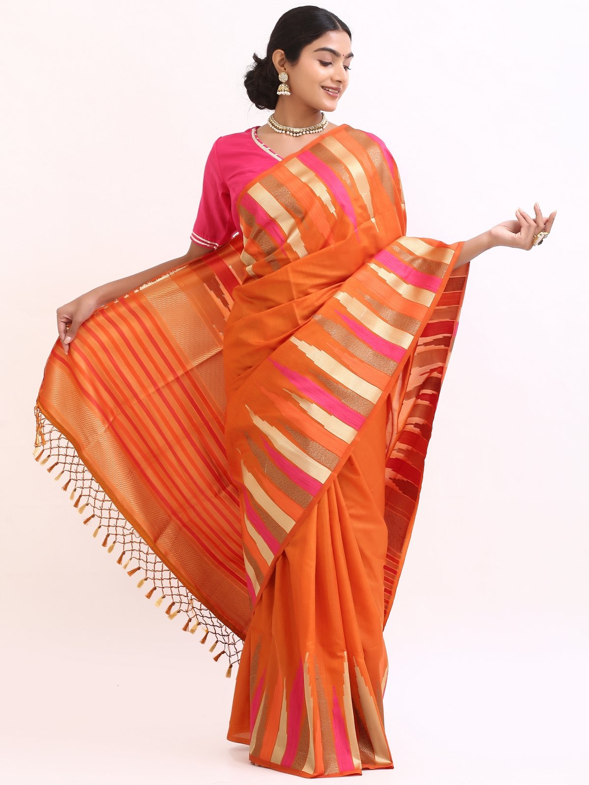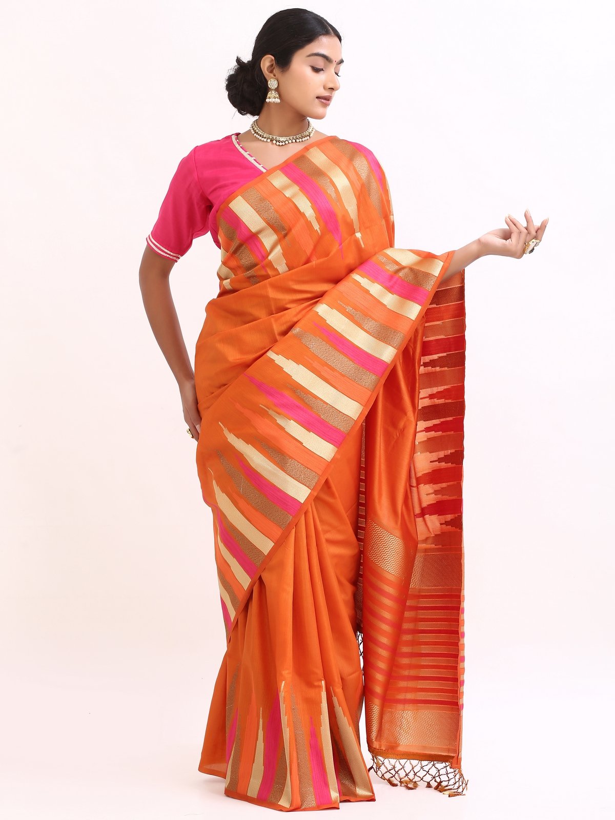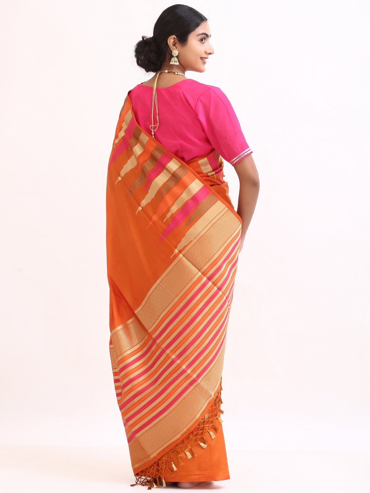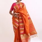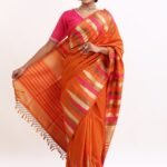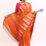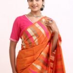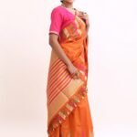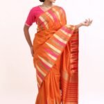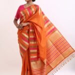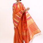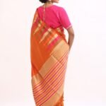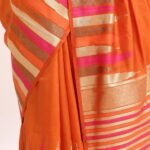 The saree glows with a deep orange base, highlighted by gold zari stripes and pink undertones that symbolize warmth , joy, and divine grace. Zari stripes run acrossthe body, enhanching the drape’s richness.