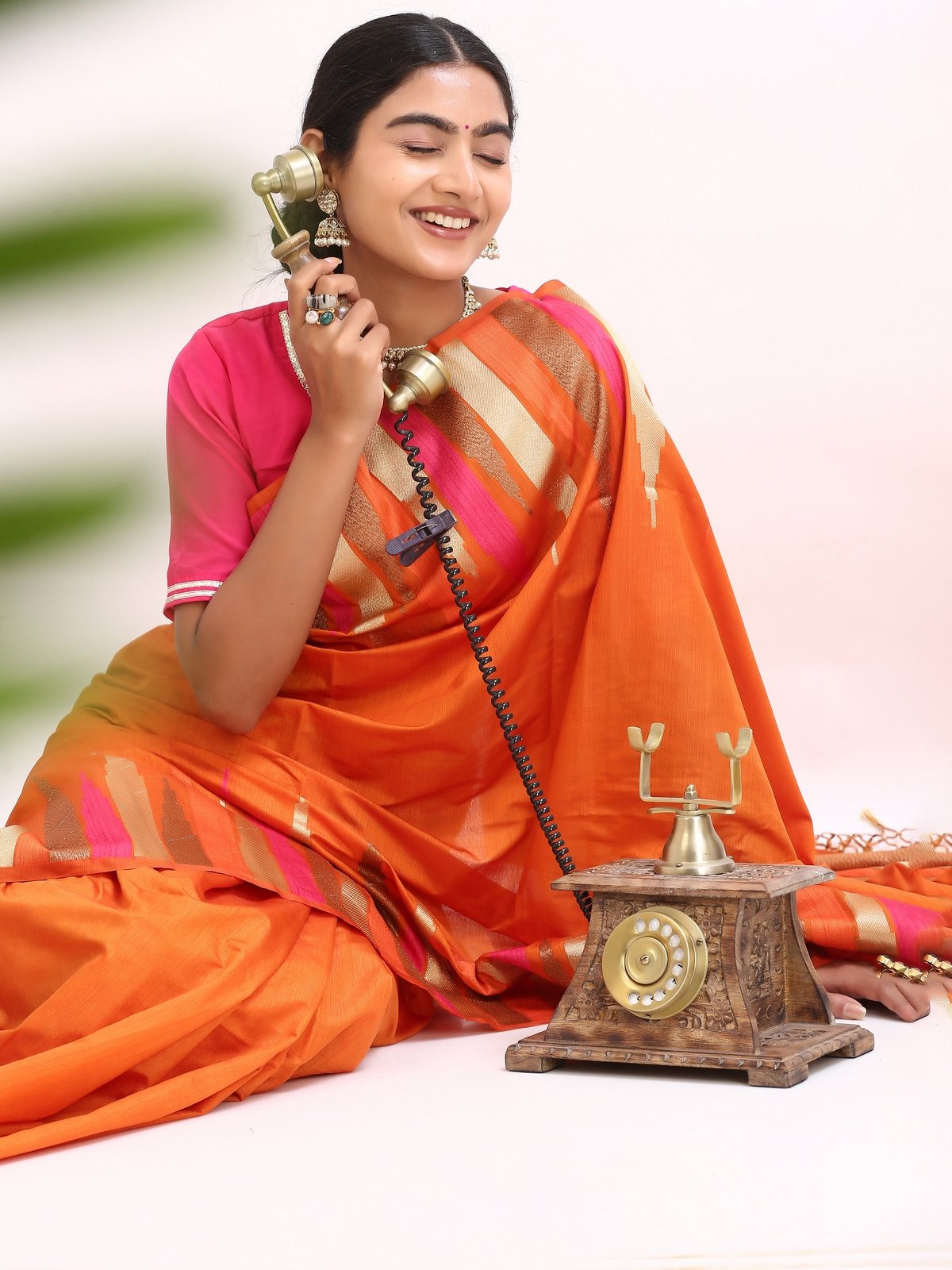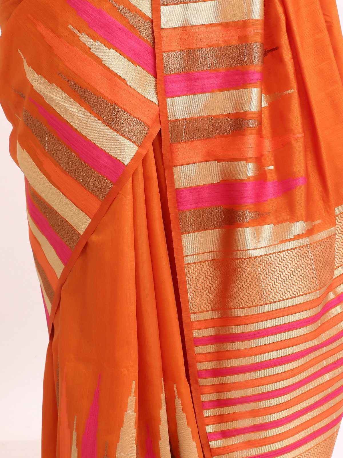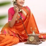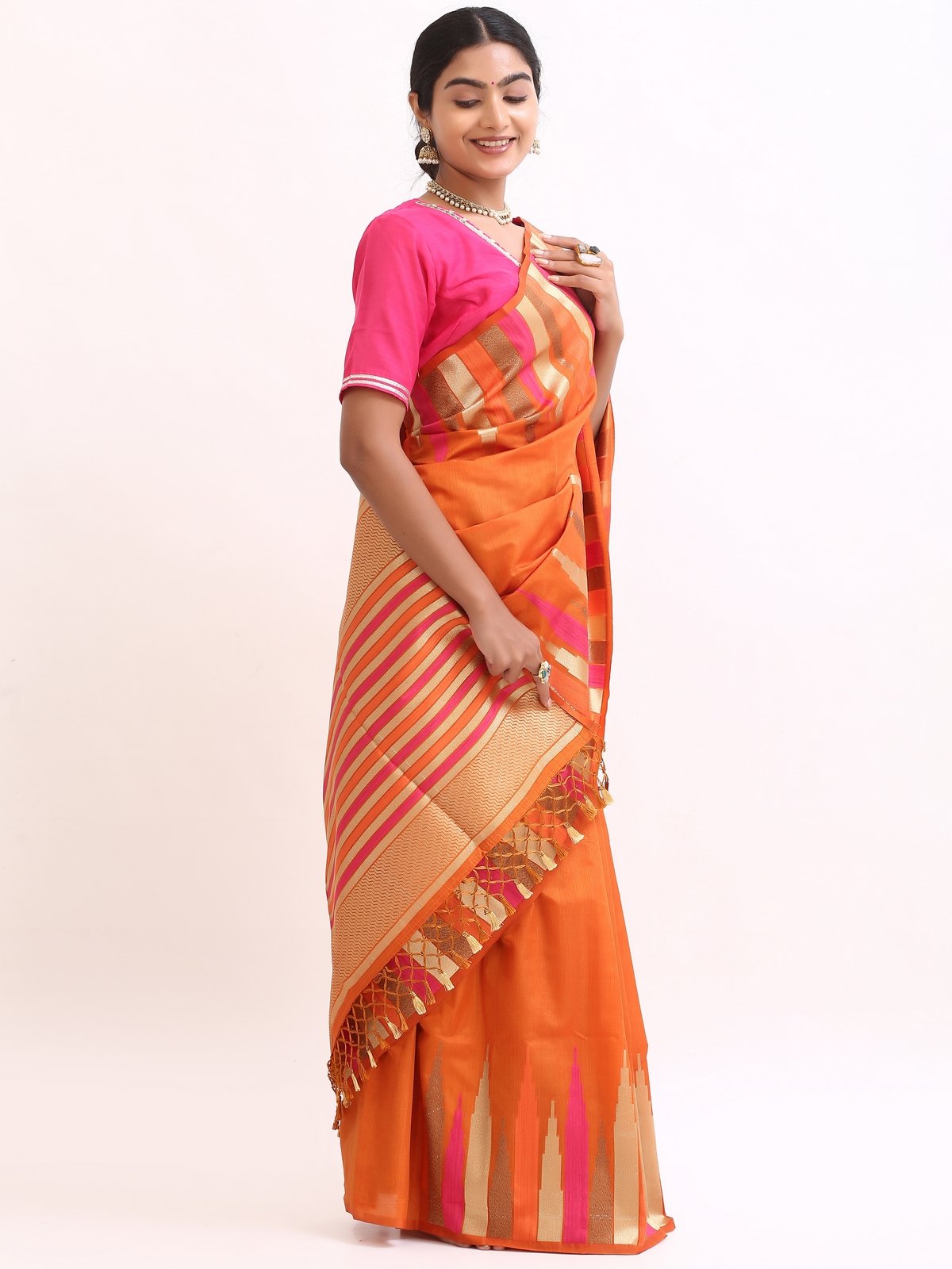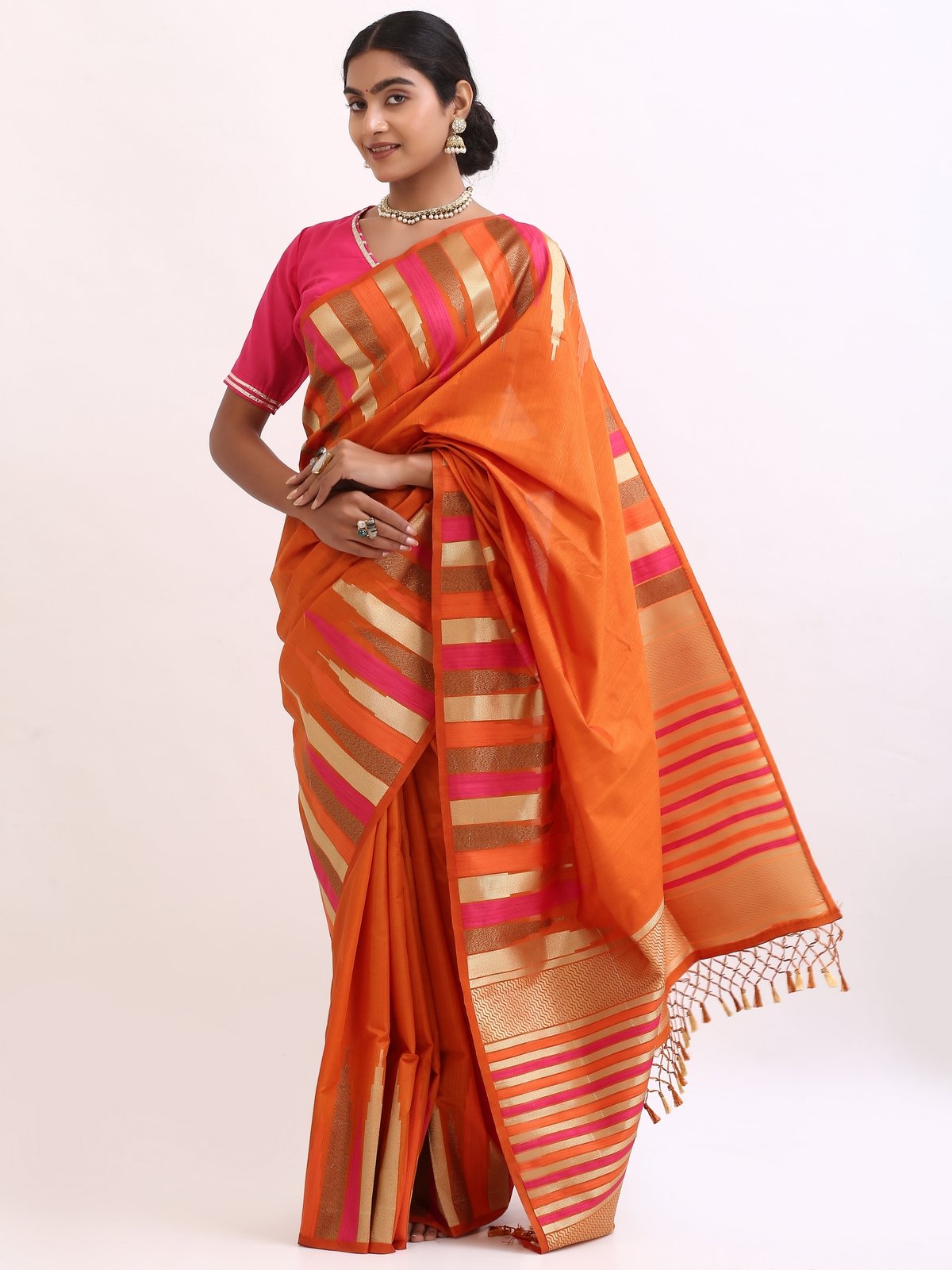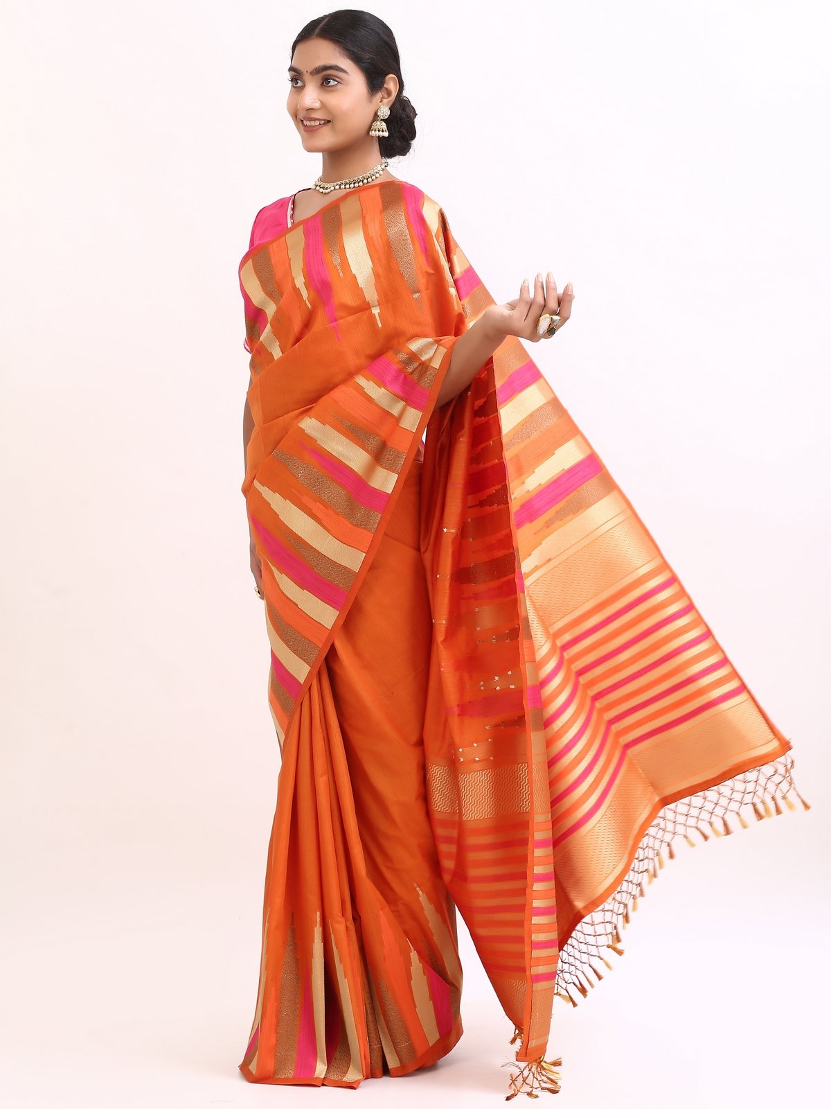 The saree glows with a deep orange base, highlighted by gold zari stripes and pink undertones that symbolize warmth , joy, and divine grace. Zari stripes run acrossthe body, enhanching the drape’s richness.