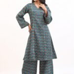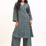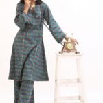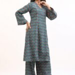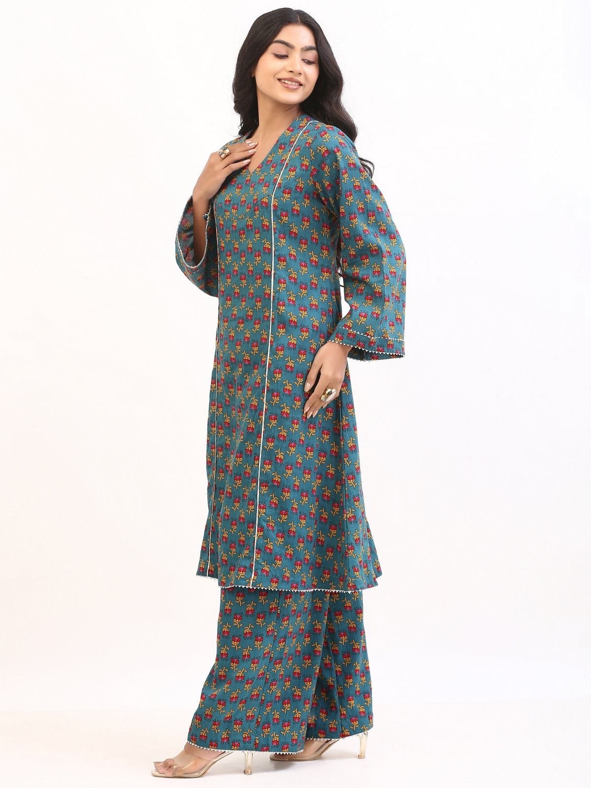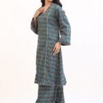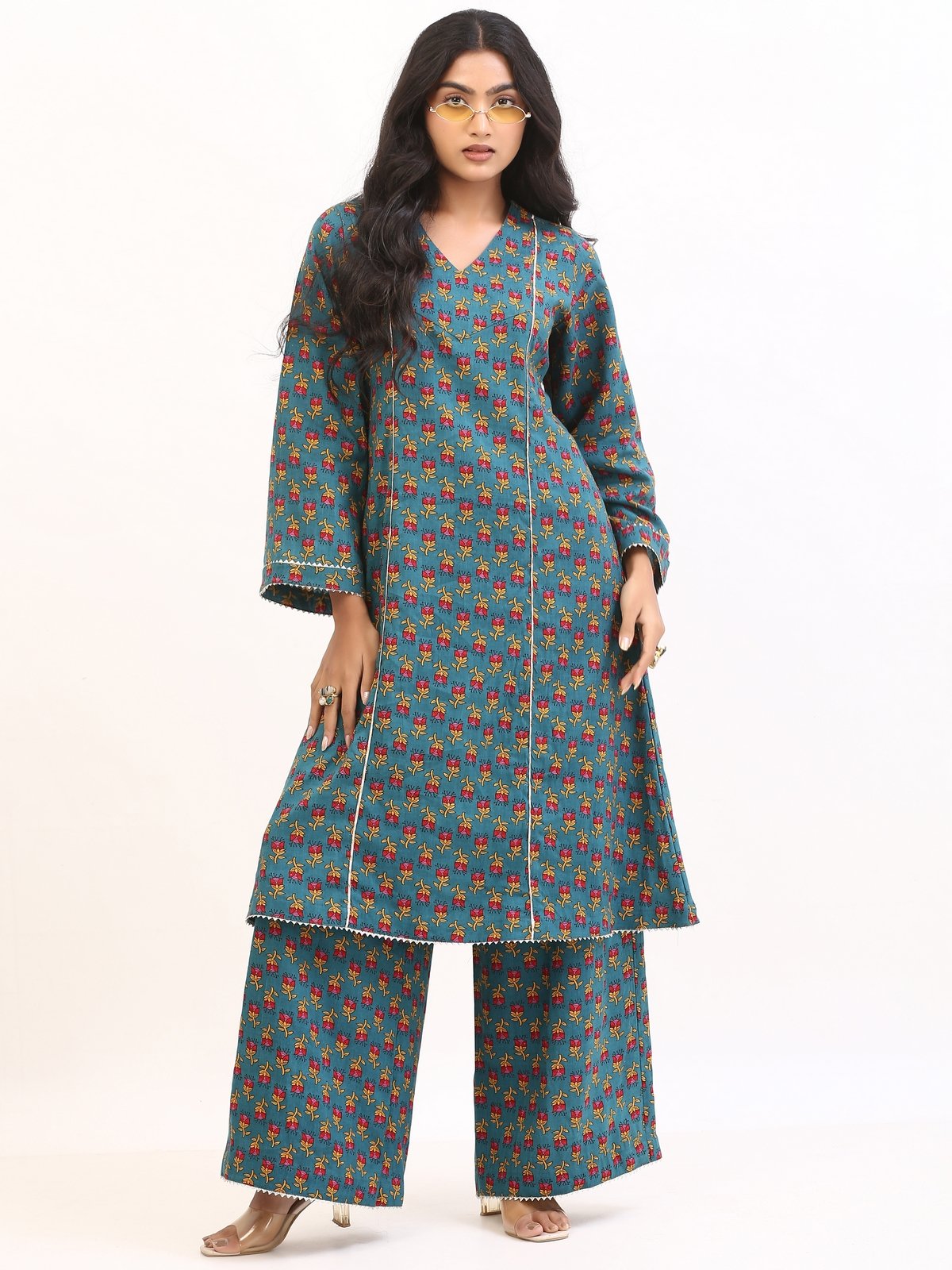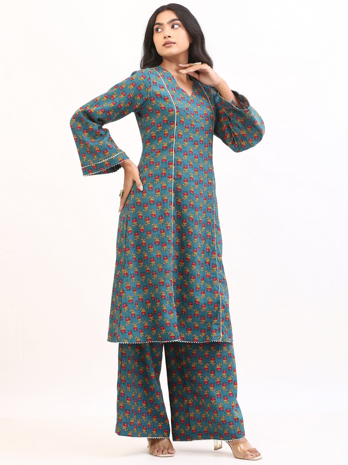 The kurta is designed with a flattering V-neckline and subtle vertical piping detail that enhances the silhouette. The relaxed A-line fit ensures day-long comfort, while the flared sleeves add a graceful touch. Paired with coordinated printed wide-leg palazzo pants, this set delivers effortless sophistication.