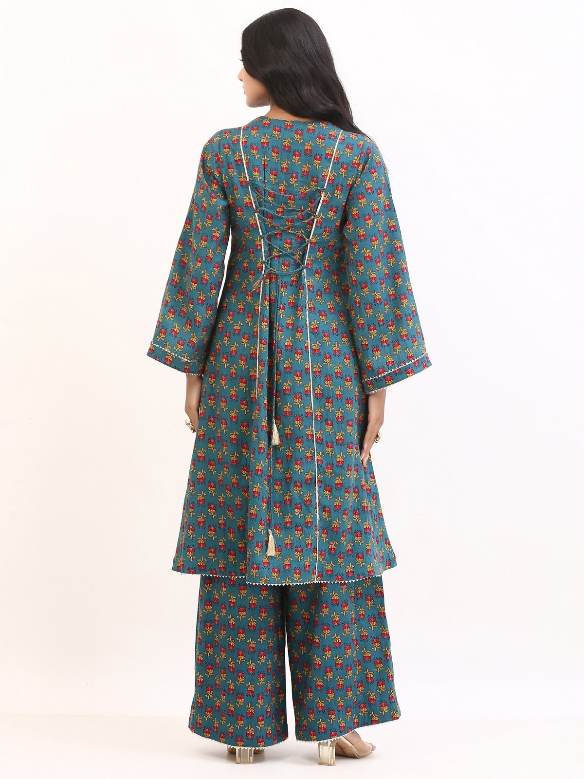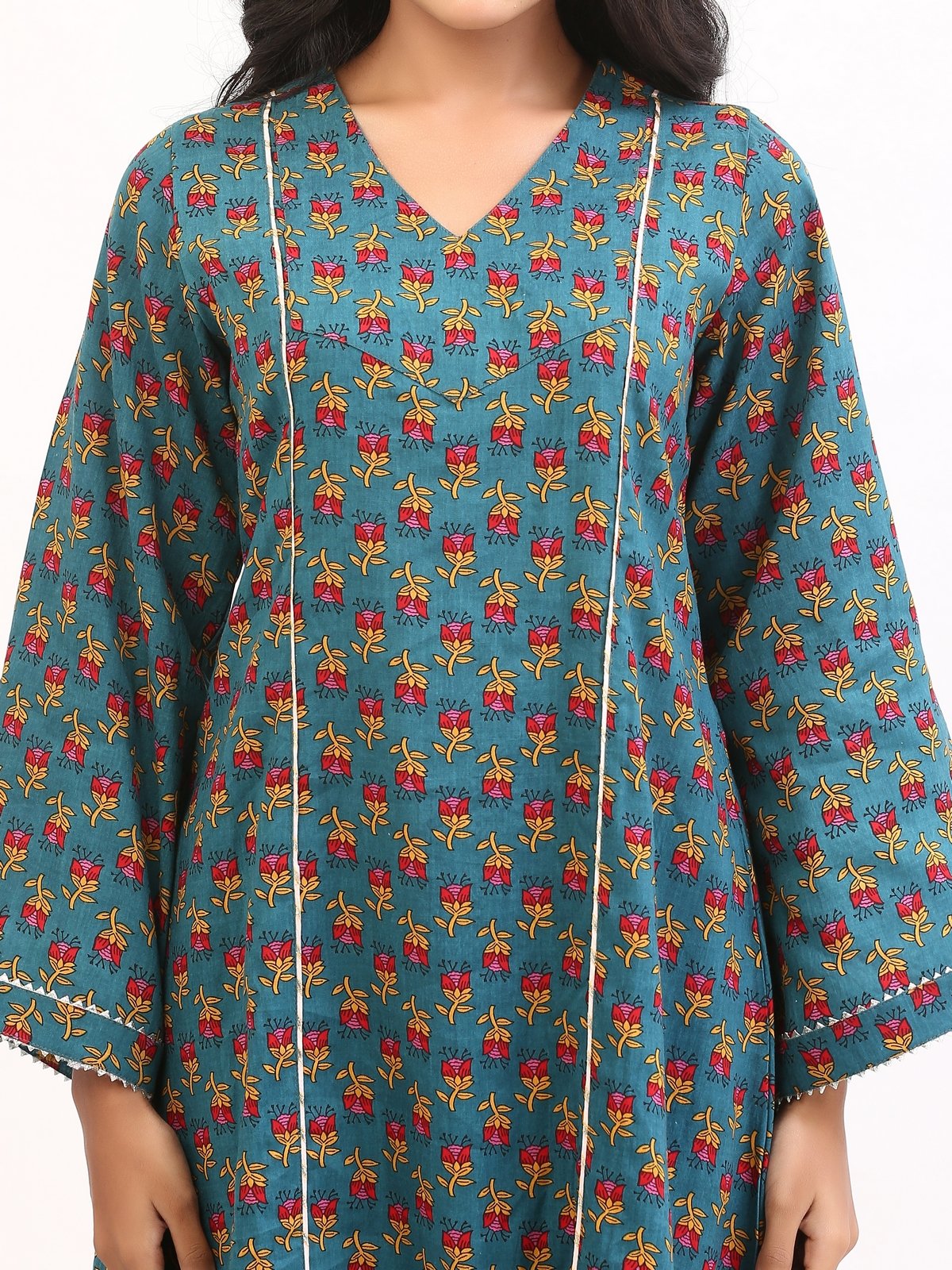 Refresh your everyday ethnic wardrobe with this elegant Teal Bloom Printed Kurta Set. Crafted in premium breathable cotton, this set features a soothing teal base adorned with delicate red and mustard floral motifs for a refined yet playful appeal.